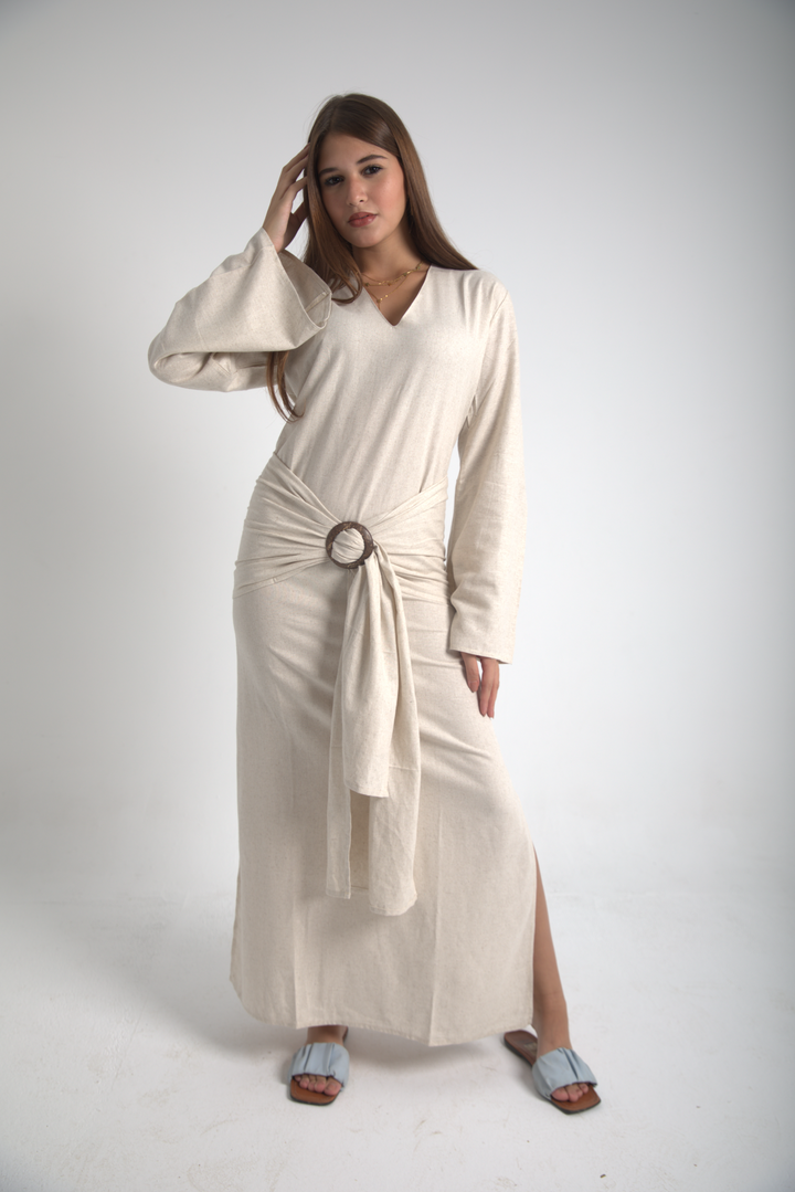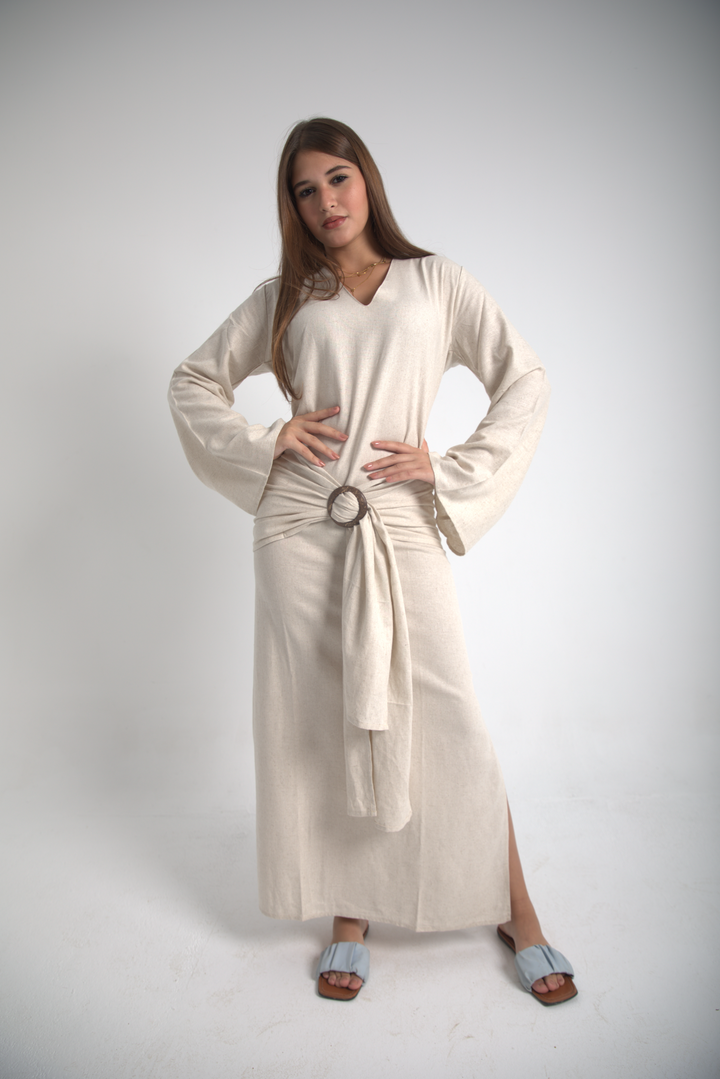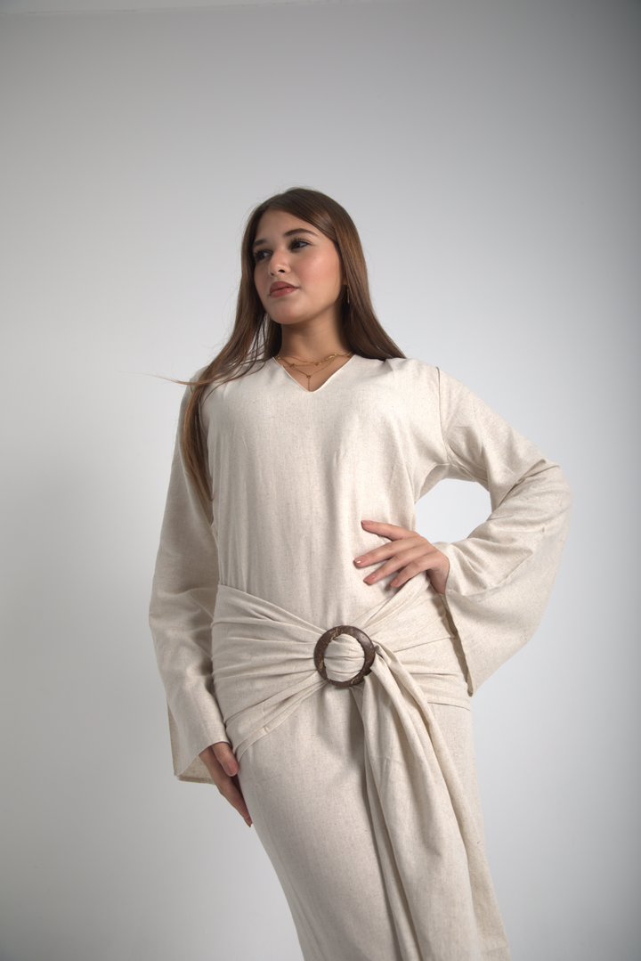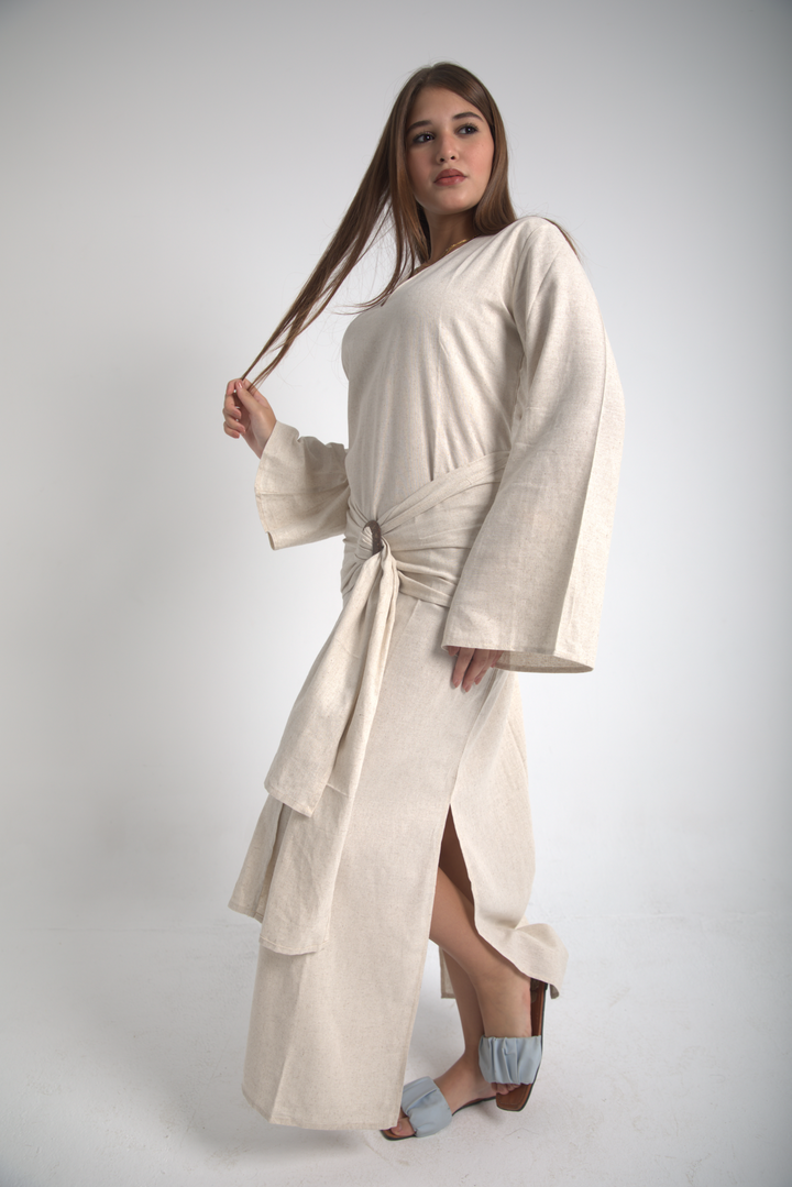 Embrace the beauty of summer with the Flor de Verano dress — a timeless piece made from soft, breathable linen. Designed with a minimalist silhouette, it features long sleeves, a gentle V-neckline, and a distinctive wrap detail at the waist, gathered with a natural wooden ring for an effortlessly flattering fit.