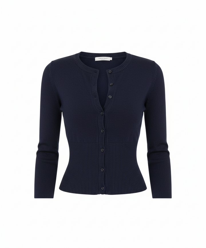 Made from a soft, stretch-knit fabric, this cardigan hugs the body in all the right places with a ribbed waist panel that enhances shape and structure. Featuring a classic round neckline and a full button-down front, it’s the perfect piece for layering or wearing on its own.