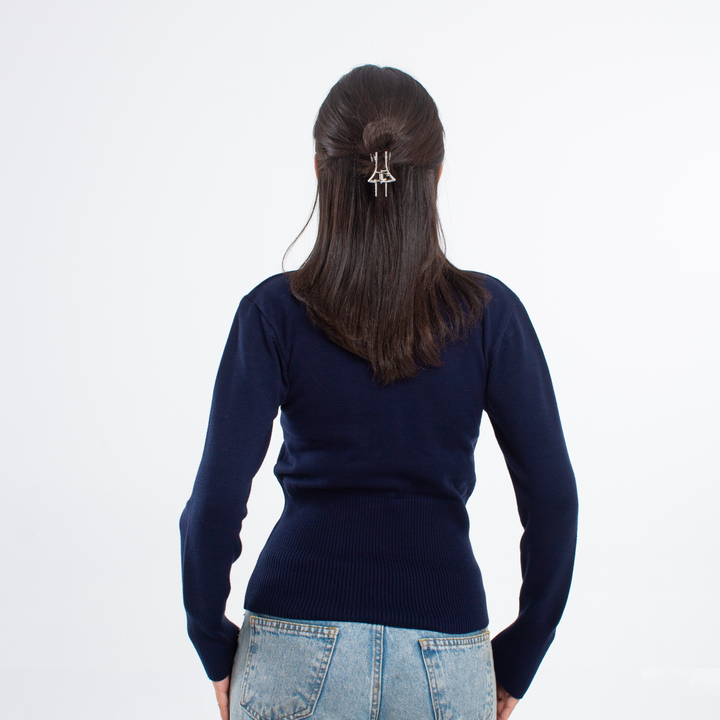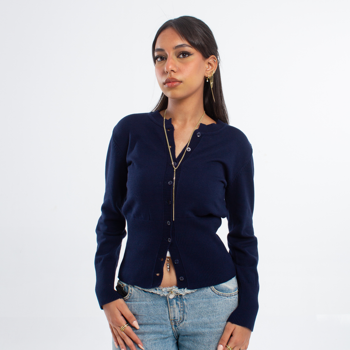 Navy Blue-Fitted Ribbed Button-Up Cardigan