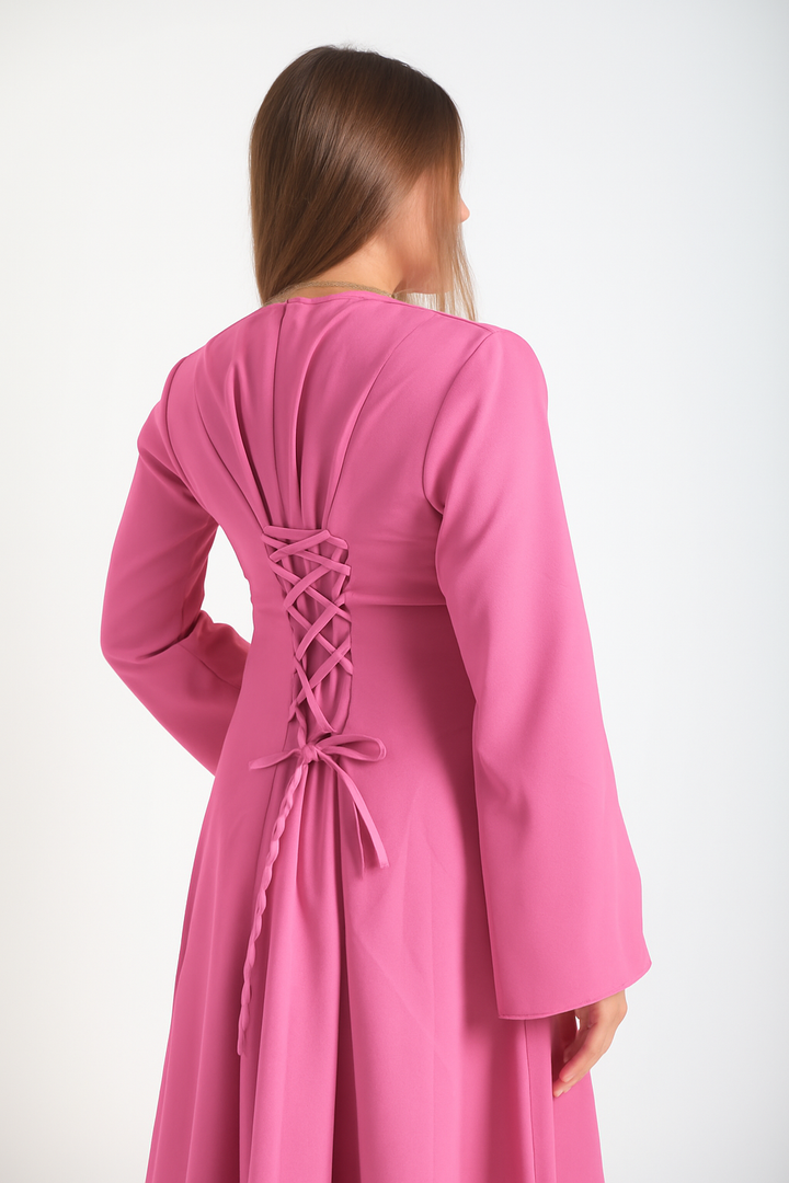 The dress is crafted in a vibrant pink shade, radiating femininity and charm. Its long sleeves and modest round neckline create a balanced, sophisticated style, while the highlight lies in the corset-inspired lace-up back, which adds both a romantic touch and an adjustable fit to accentuate the waistline.